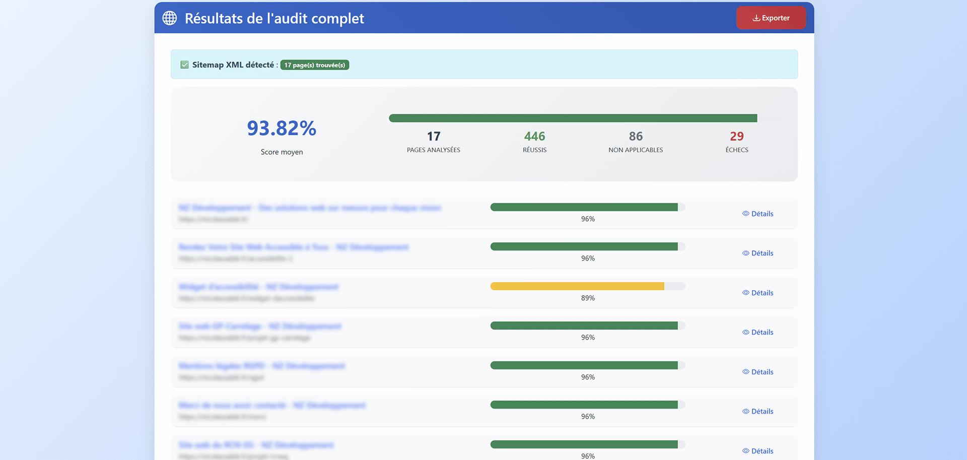 – Audit Complet & Rapide : Analysez la conformitĂ© de vos pages web selon 14 thĂ©matiques et 43 critères RGAA en quelques secondes. Fini les audits qui prennent des heures !