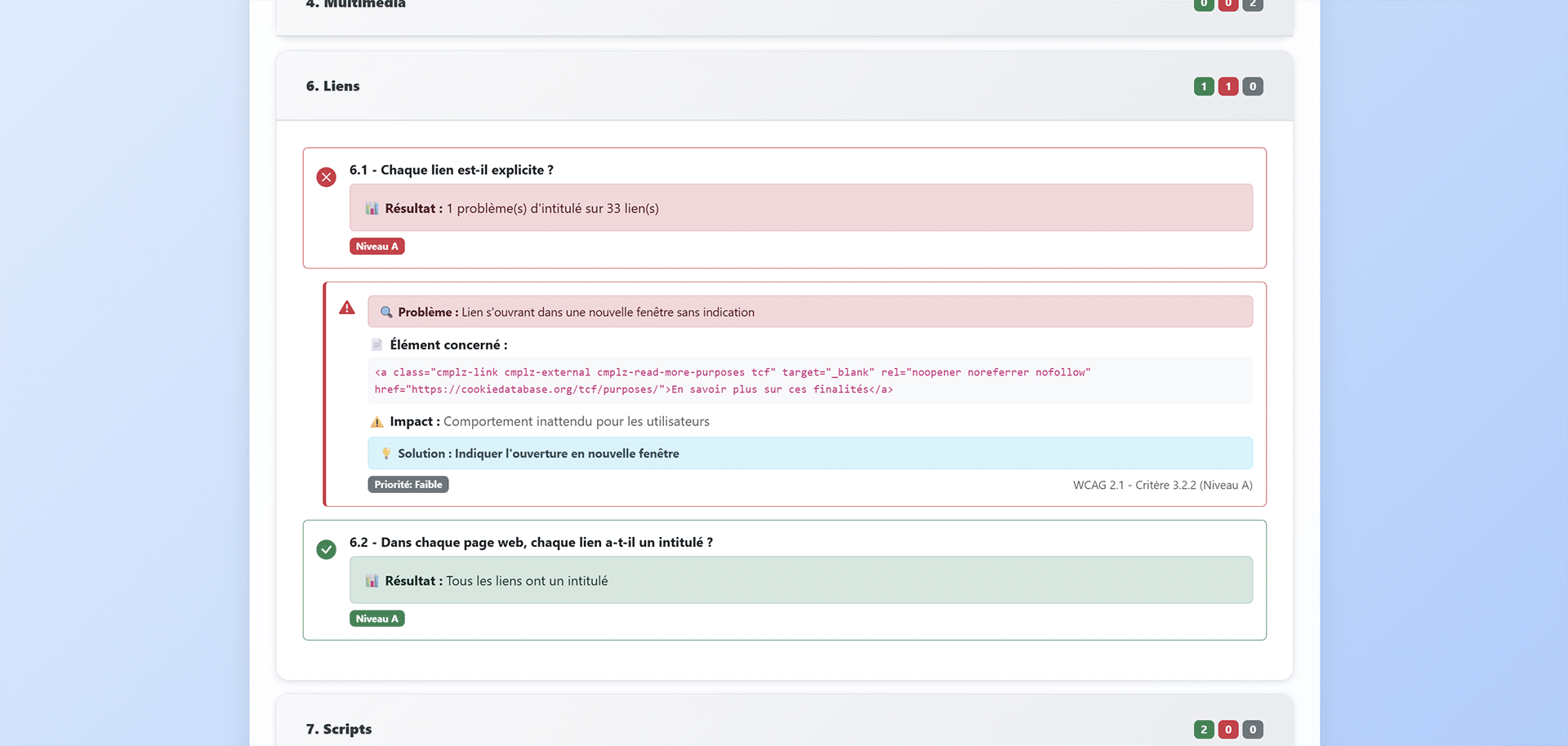 – Rapports Clairs : Visualisez un score de conformitĂ© prĂ©cis et une analyse dĂ©taillĂ©e par thĂ©matique pour mieux cibler vos efforts.