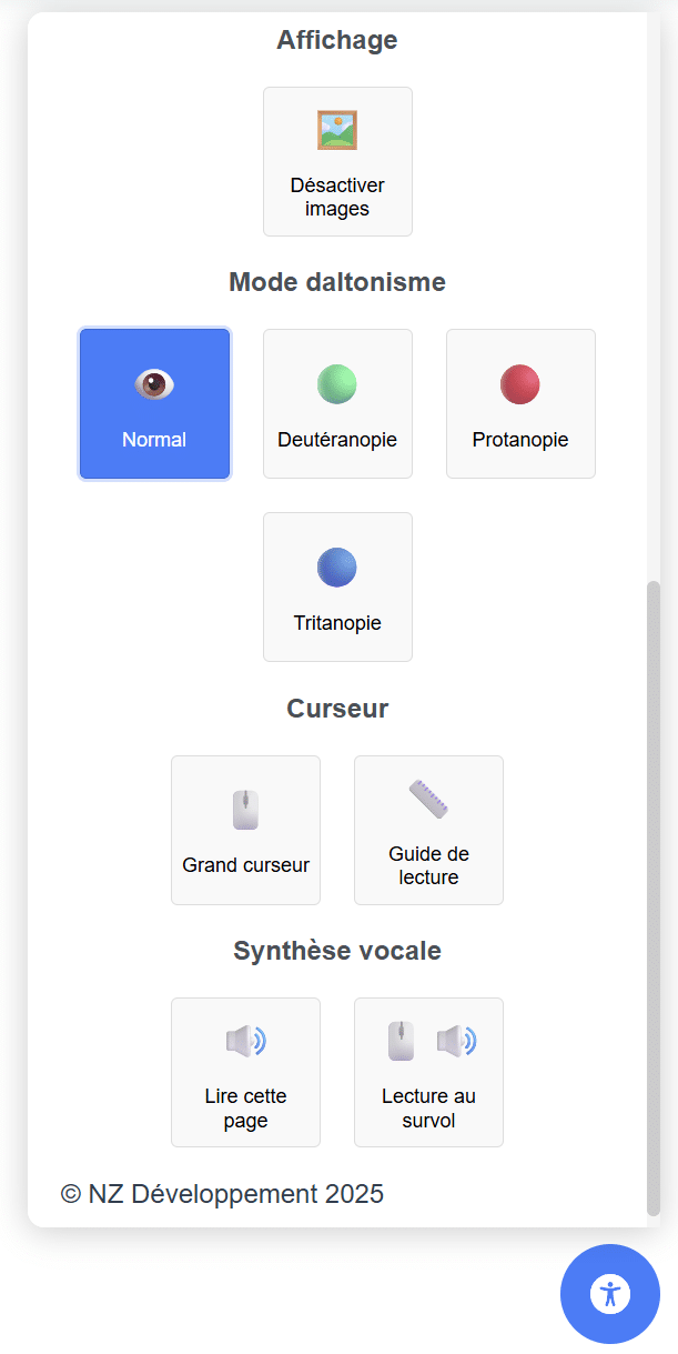 Ce widget est conçu pour être discret et facile à utiliser, avec un bouton flottant permettant d’accéder au panneau des options. Il s’intègre facilement à n’importe quel site web grâce à un fichier JavaScript et un fichier CSS dédiés.